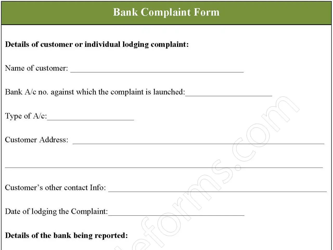 A Bank Complaint Form is a document for customers or any other individuals and needs to be filled out to convey their grievances/ complaints to the respective bank authorities. It is a part of the official bank thread which records that a particular individual has made known his/ her dissatisfactions with the bank’s work/ service. The authorities thus address and take the required action to seek out the problems.