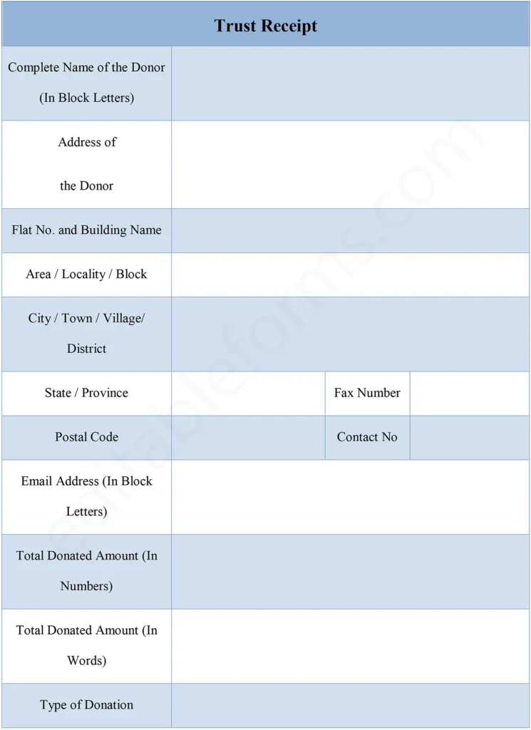 You can Download the Fillable Trust Receipt Form, customize it according to your needs, and Print it. Fillable Trust Receipt Form is either in MS Word or Editable PDF.