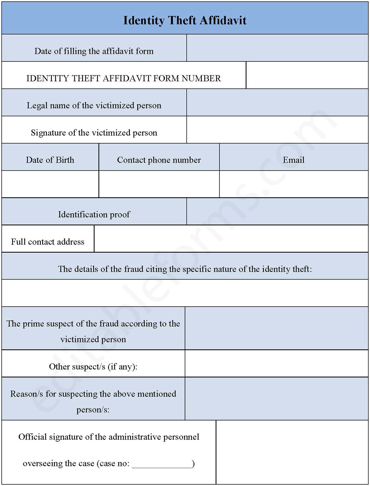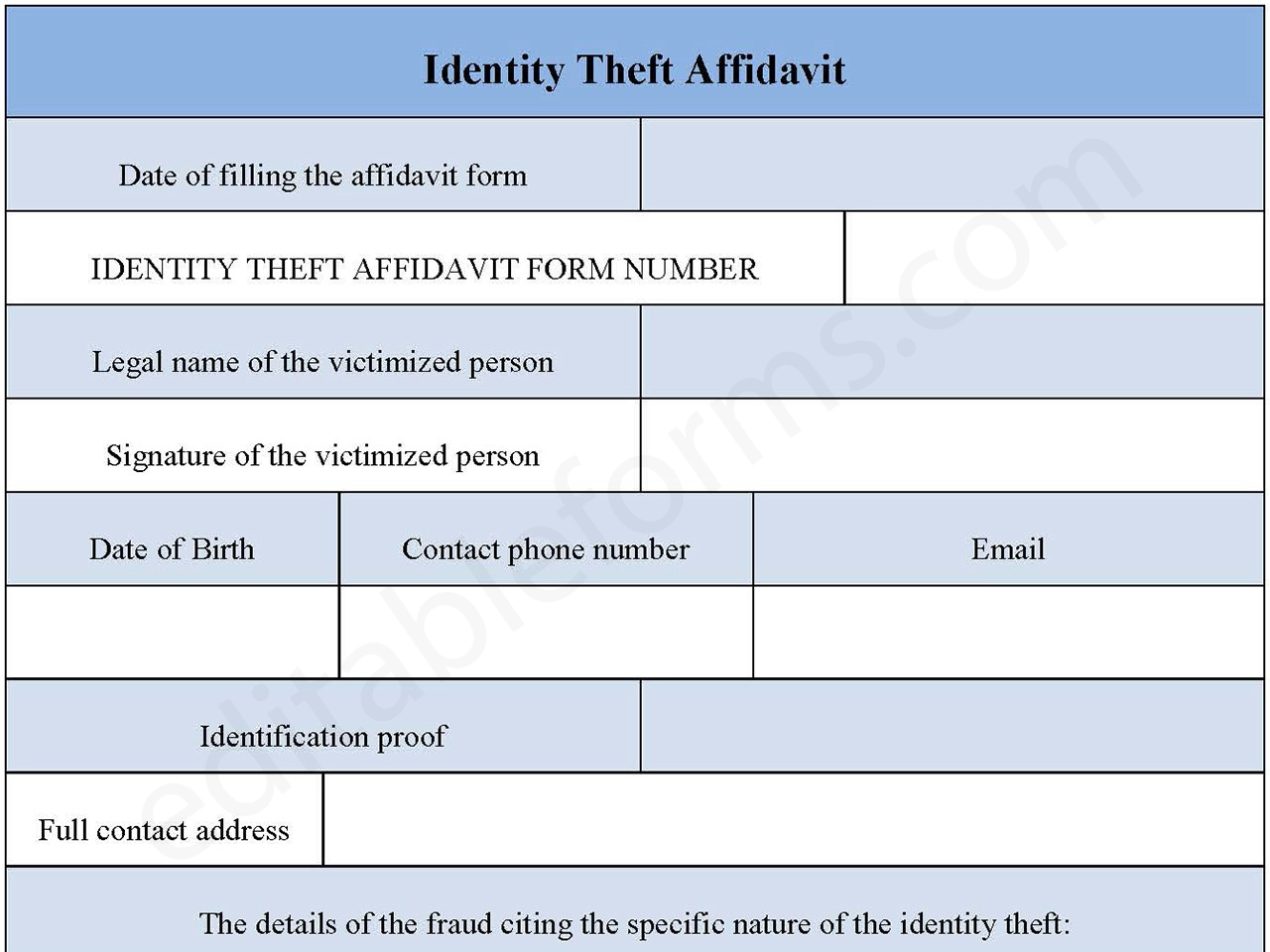 You can Download the Editable Identity Theft Form PDF, customize it according to your needs, and Print it. Identity Theft Affidavit Form PDF is either in MS Word or Editable PDF.