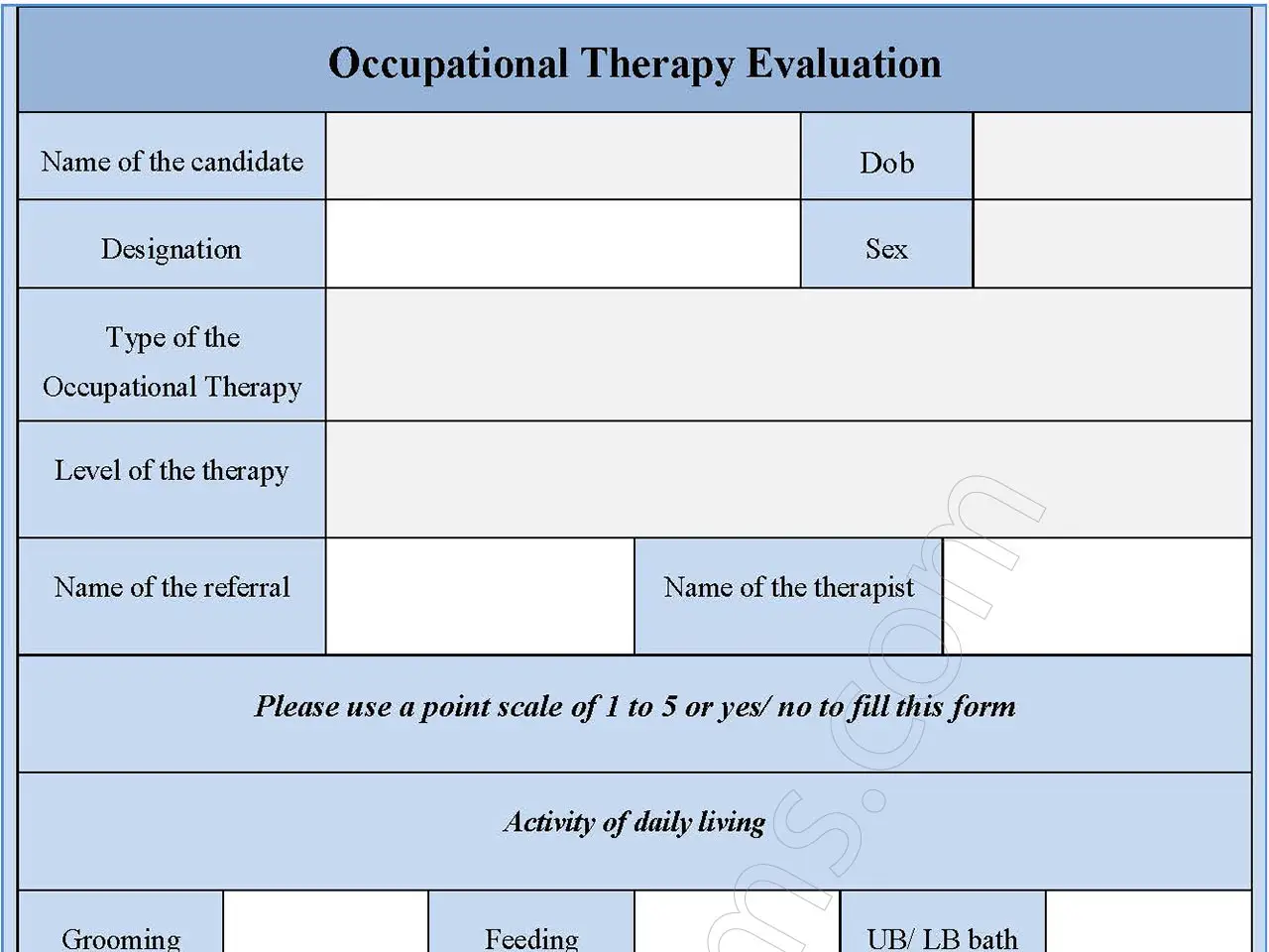 An occupational therapy evaluation form is filled by a physician or a therapist by considering people, students and employees in order to measure their purposeful activities noticed after conducting a therapy. Such a therapy program is conducted for improving neuromuscular skeletal functions and psychological activities of the concerned pupils.