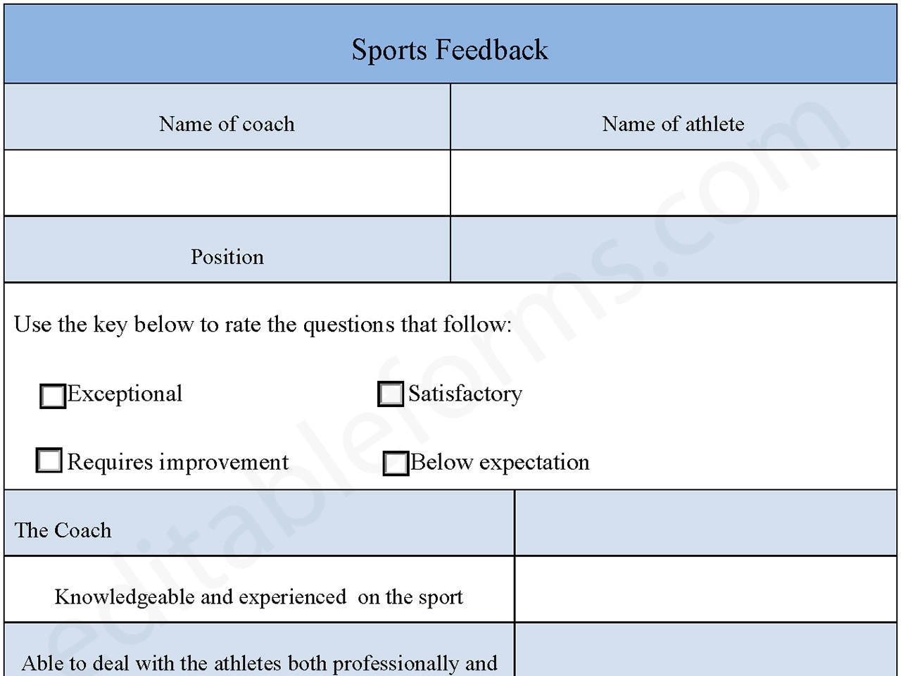 You can Download the Sports Feedback Form PDF, customize it according to your needs, and Print it. Sports Feedback Form PDF is either in MS Word or Editable PDF.