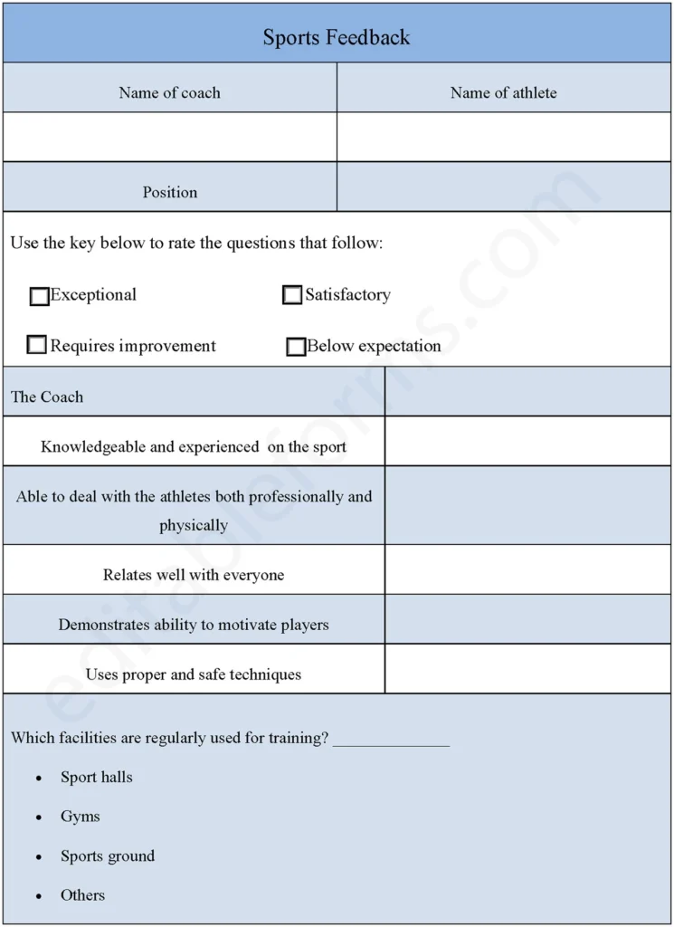 The Sports Feedback Form is a simple and effective tool for evaluating coaching performance and improving training quality. It helps teams grow, improve skills, and achieve better results.