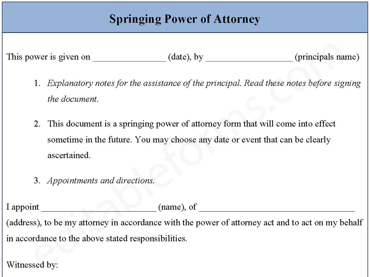 You can Download the Springing Power of Attorney Form PDF, customize it according to your needs, and Print it. Springing Power of Attorney Form PDF is either in MS Word or Editable PDF.
