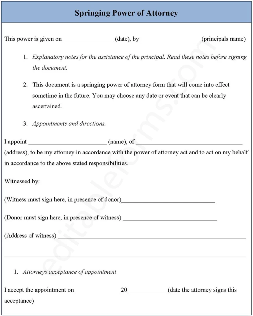 The Springing Power of Attorney Form is a smart and effective legal tool for future planning. It ensures that your decisions are handled by a trusted person only when necessary, providing security and peace of mind.