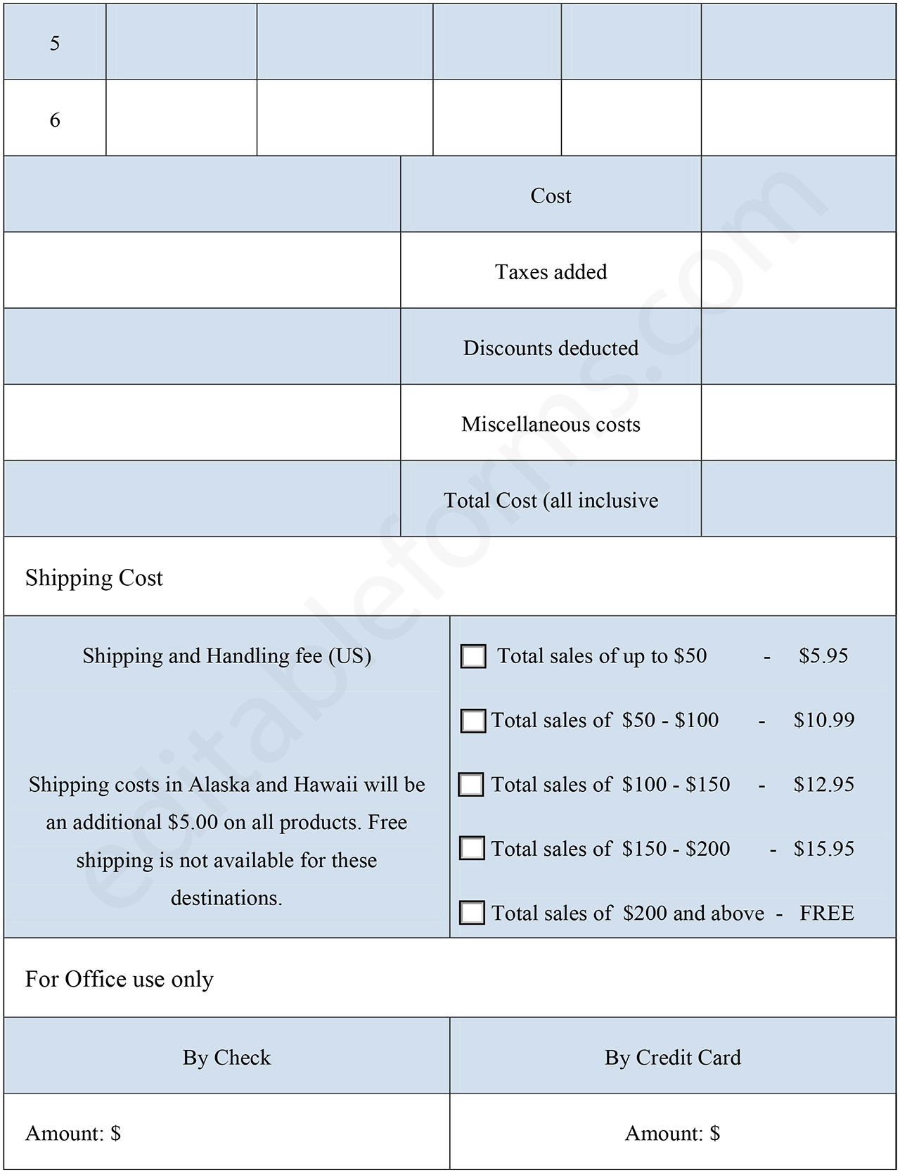The form includes a structured shipping cost table based on total order value, including special conditions for certain locations.