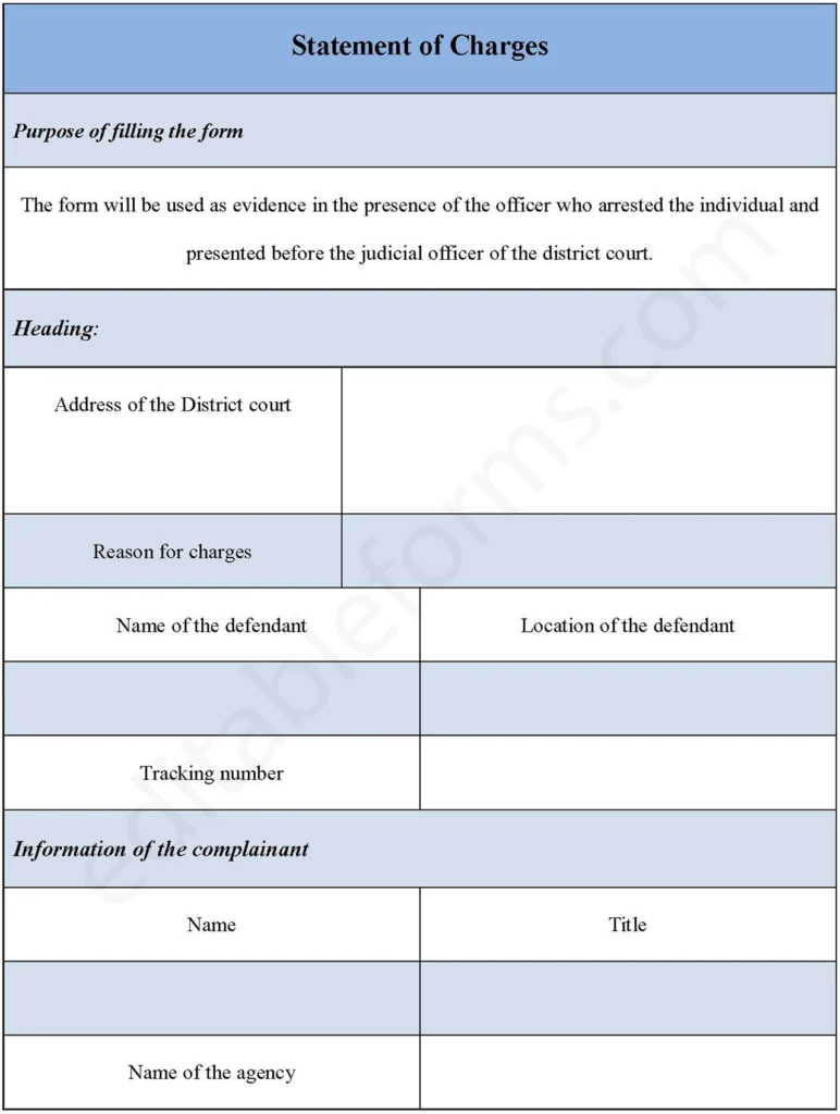 The Statement of Charges Form is a simple and effective tool for legal documentation. It ensures accurate recording of charges and supports professional handling of legal cases.