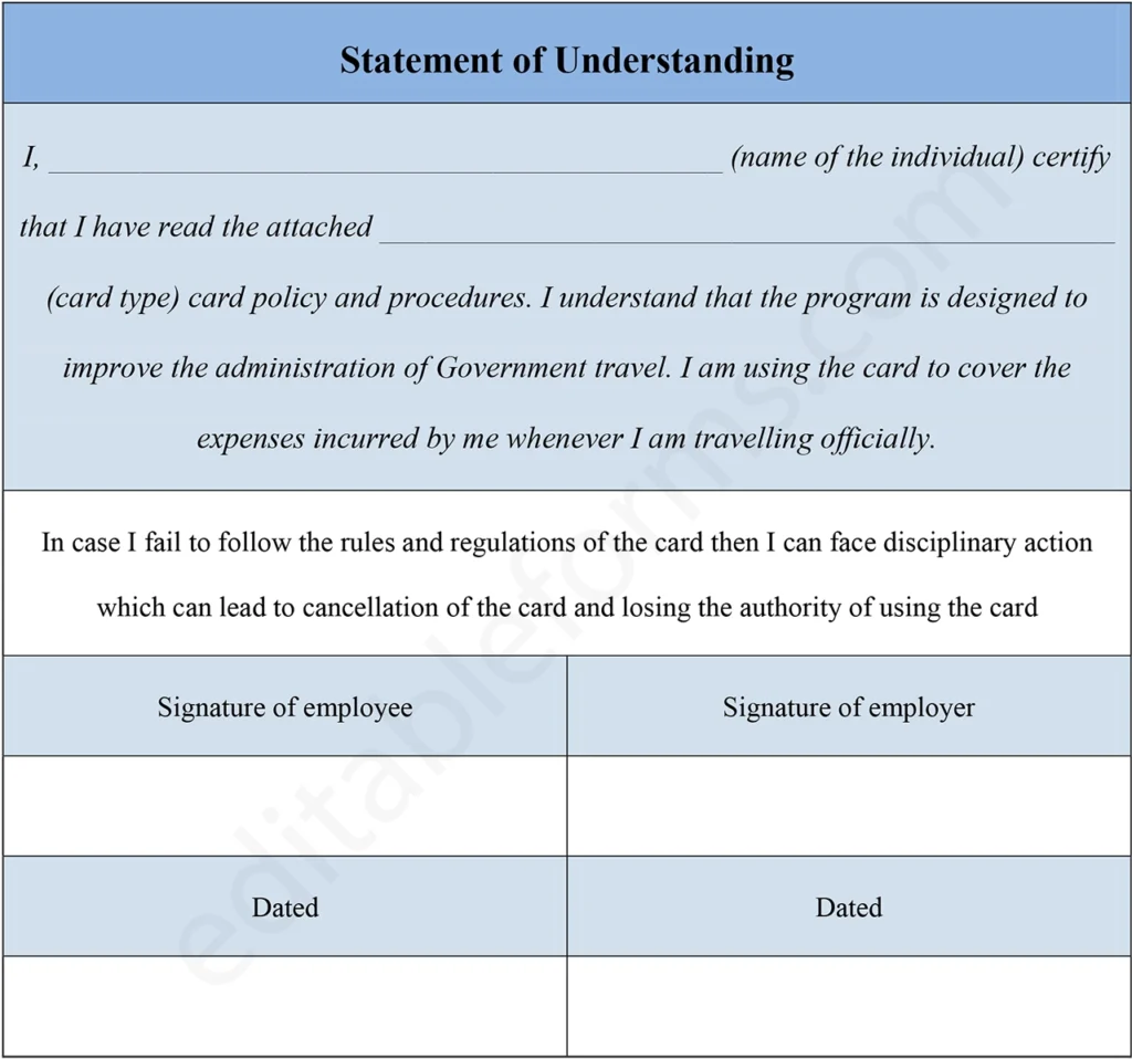The Statement of Understanding Form is a simple and effective tool for confirming policy awareness and agreement. It supports clear communication, compliance, and professional record-keeping in any organization.