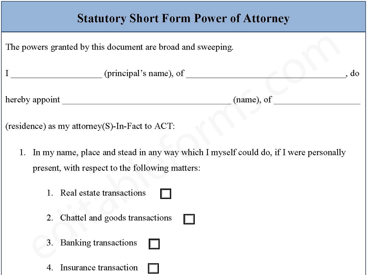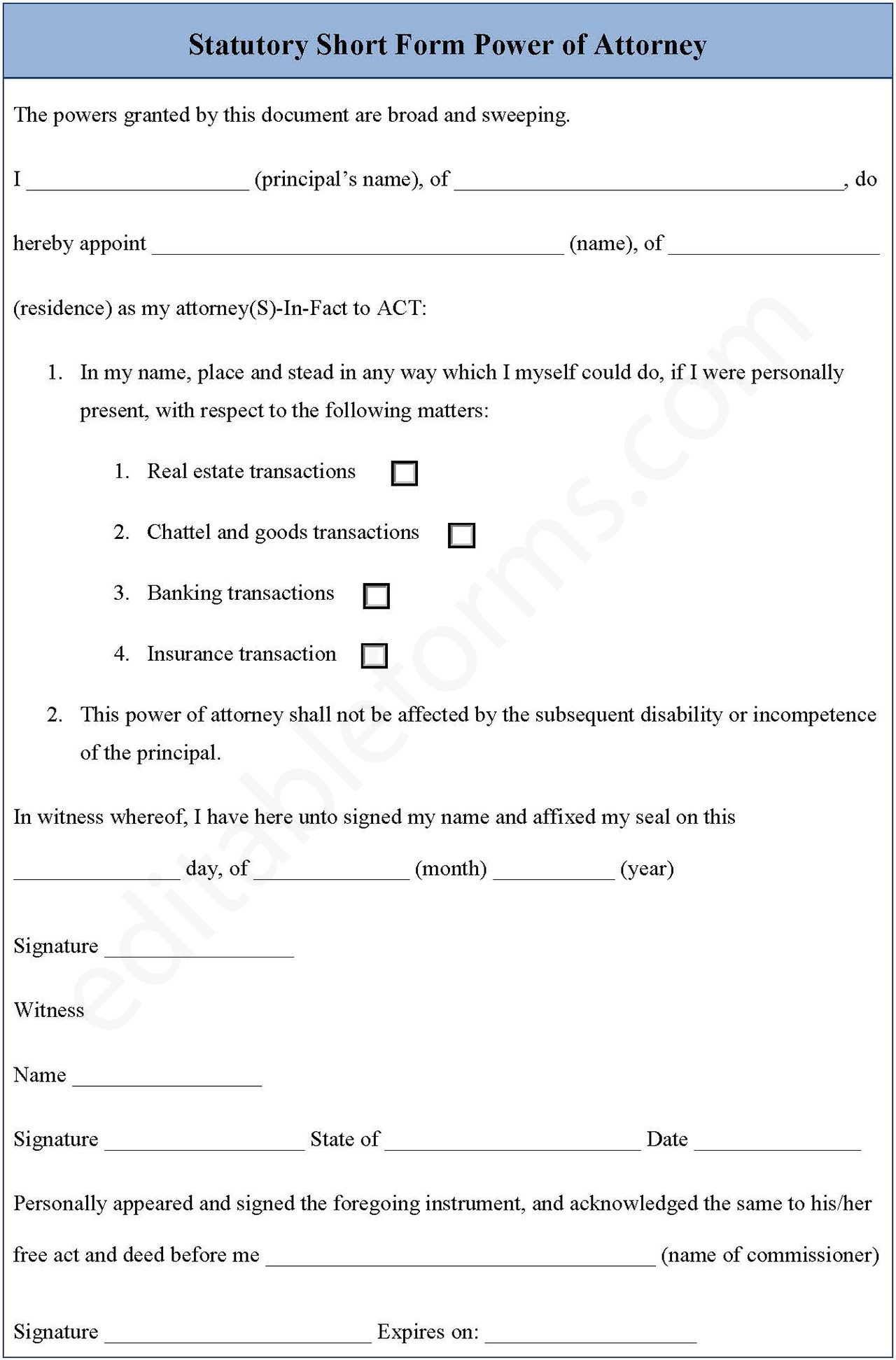 The Statutory Short Form Power of Attorney allows a person (principal) to appoint another individual (agent or attorney-in-fact) to manage important matters such as banking, real estate, and insurance.