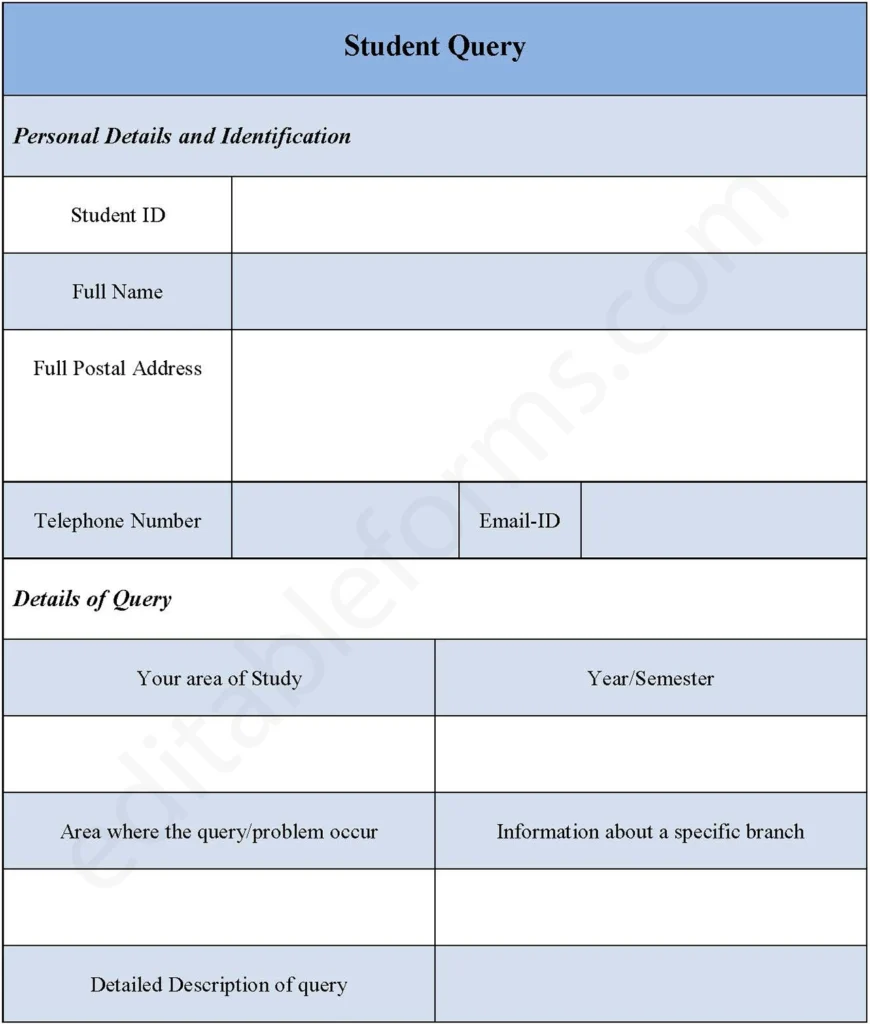 This digital Student Query Form helps institutions manage student requests more efficiently. It ensures that all queries are recorded properly and handled in a timely manner.
