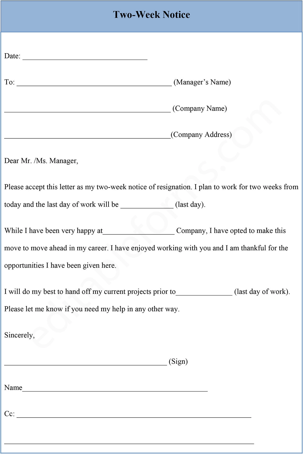 You can Download the Two Week Notice Form, customize it according to your needs, and Print it. Two Week Notice Form is either in MS Word or Editable PDF.